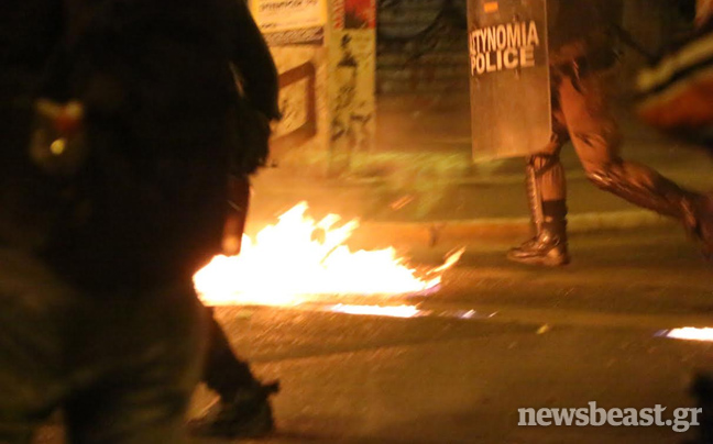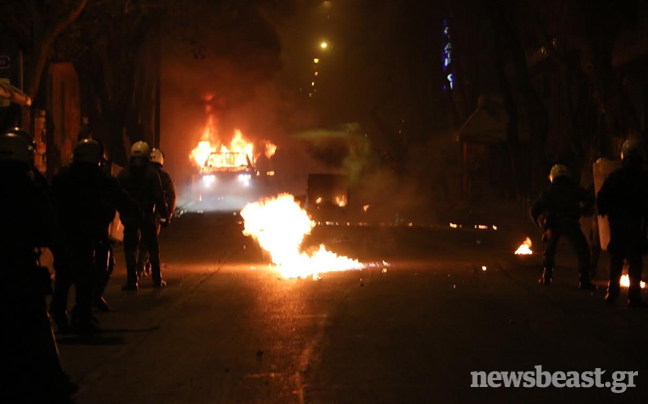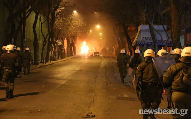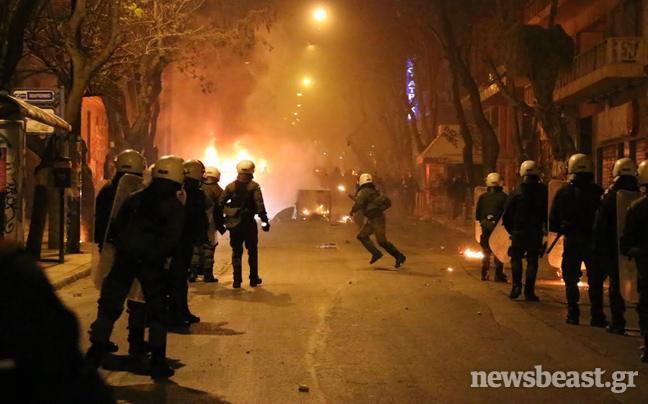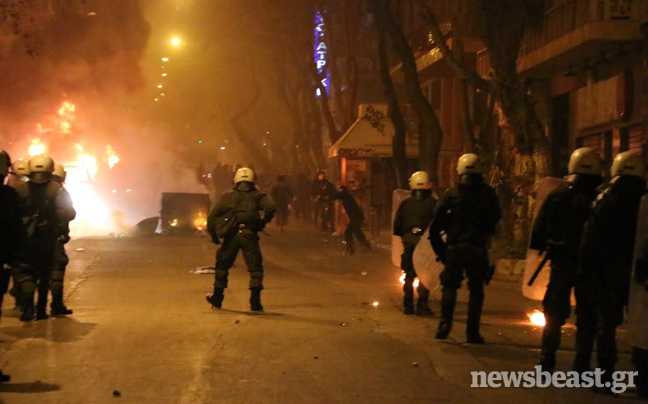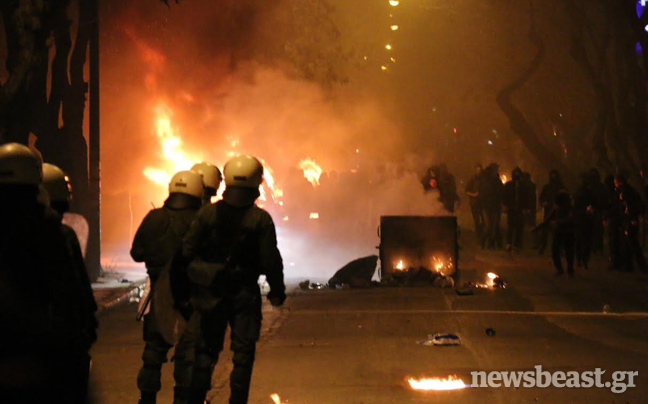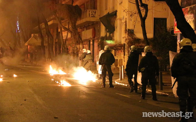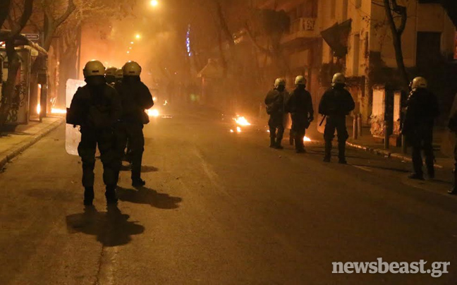 Μια ομάδα περίπου 100 ατόμων μπαινοβγαίνει στο Πολυτεχνείο και πραγματοποιεί επιθέσεις με βόμβες μολότοφ και φωτοβολίδες κατά των ΜΑΤ που προσπαθούν να περιορίσουν την δράση τους εκτοξεύοντας δακρυγόνα, χημικά και χειροβομβίδες κρότου- λάμψης.