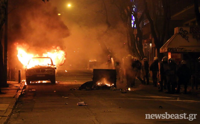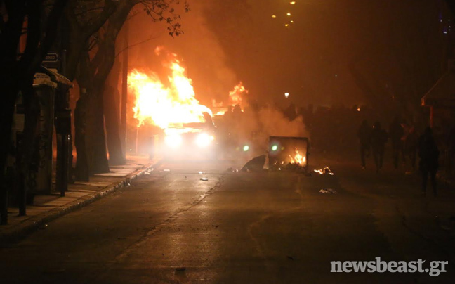 Μέχρι στιγμής έχουν παραδοθεί στις φλόγες πολλοί κάδοι απορριμμάτων που χρησιμοποιούνται σαν φλεγόμενα οδοφράγματα ενώ αυτή την ώρα καίγονται και τέσσερα αυτοκίνητα τα οποία ήταν παρκαρισμένα στην οδό Στουρνάρη τη στιγμή που ξεκίνησαν τα επεισόδια.