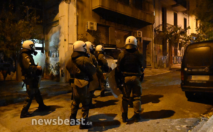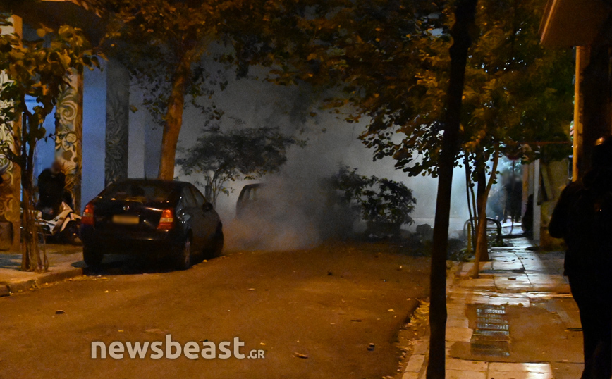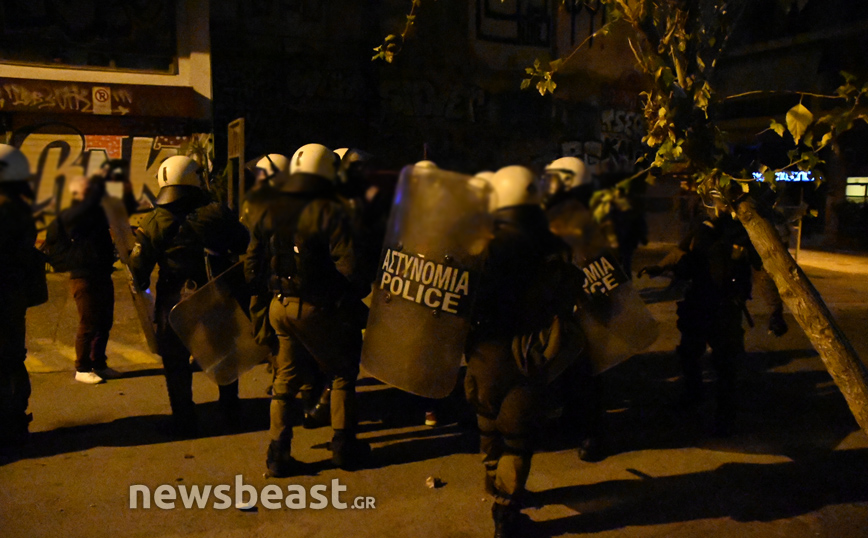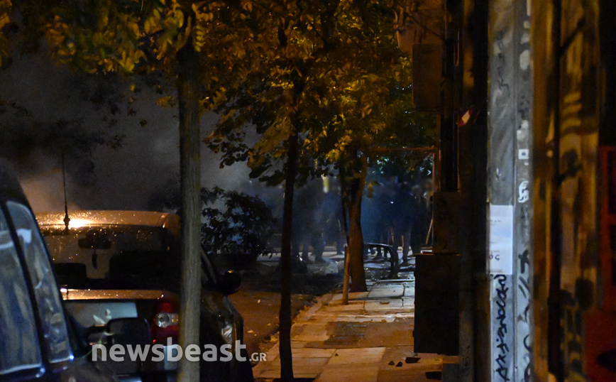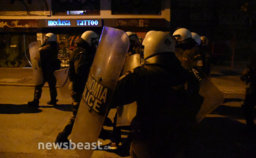 Η ατμόσφαιρα στην πλατεία των Εξαρχείων είναι αποπνικτική από τα χημικά που έχουν πέσει. Στην οδό Στουρνάρη, οι αρχές με κρότου λάμψης προσπαθούν να απομακρύνουν τους διαδηλωτές.