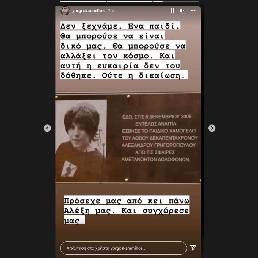 «Δεν ξεχνάμε. Ένα παιδί. Θα μπορούσε να είναι δικό μας. Θα μπορούσε να αλλάξει τον κόσμο και αυτή η ευκαιρία δεν του δόθηκε. Ούτε η δικαίωση. Πρόσεχέ μας από εκεί πάνω Αλέξη μας και συγχώρεσέ μας» έγραψε ο ηθοποιός Γιώργος Καραμίχος σε ένα instastory το οποίο «ανέβασε» και συνόδεψε το μήνυμα του με μια φωτογραφία του αδικοχαμένου Αλέξανδρου Γρηγορόπουλου.
