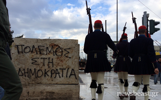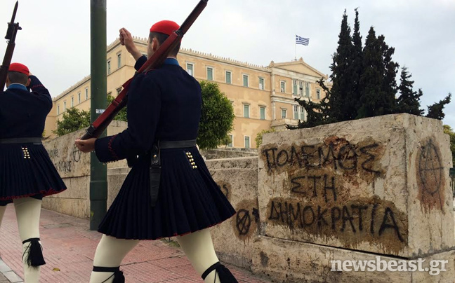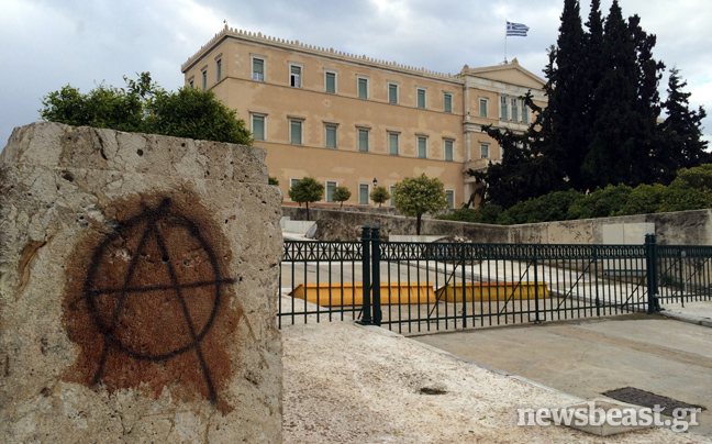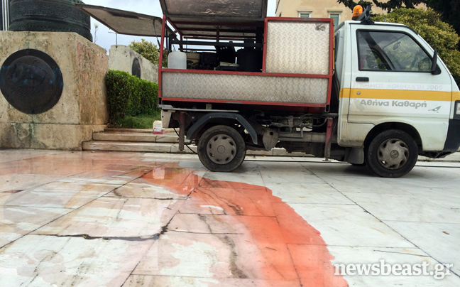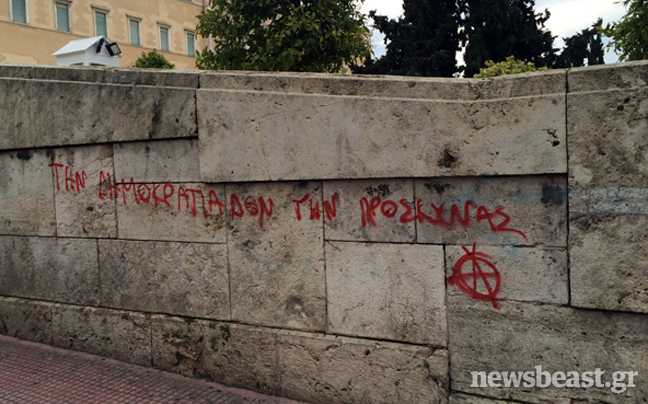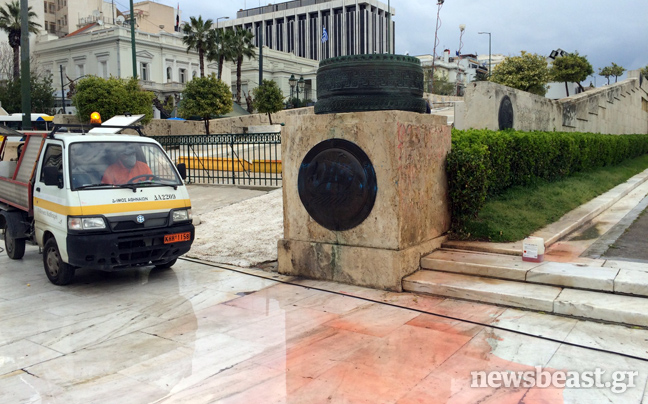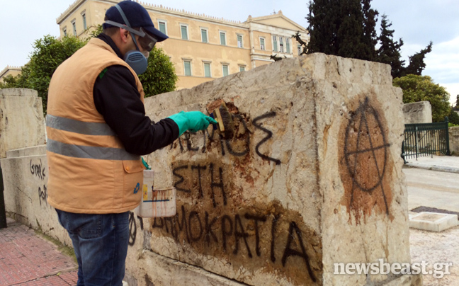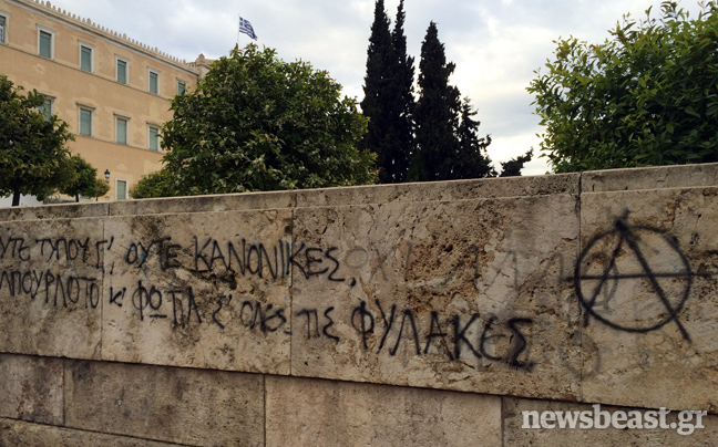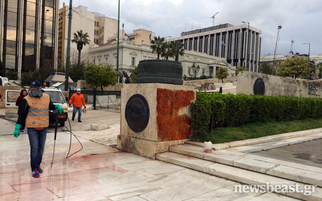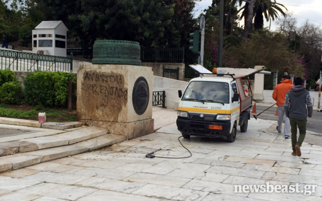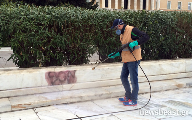 Από τις πρώτες πρωινές ώρες συνεργεία καθαρισμού επιχειρούν στον προαύλιο χώρο της Βουλής στην πλατεία Συντάγματος για να σβήσουν τα δεκάδες συνθήματα που έγραψαν στους τοίχους αντιεξουσιαστές κατά τη διάρκεια της χθεσινής τους πορείας, που κατέληξε με εκτεταμένα επεισόδια στην περιοχή των Εξαρχείων.