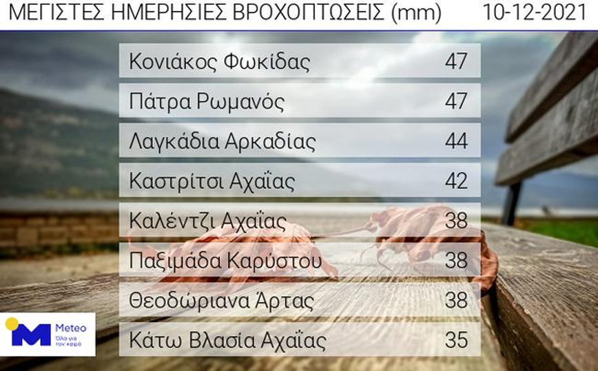 Σύμφωνα με το δίκτυο των αυτόματων μετεωρολογικών σταθμών του Εθνικού Αστεροσκοπείου Αθηνών/meteo.gr, το μεγαλύτερο ύψος βροχής καταγράφηκε στην Πάτρα (Ρωμανός) και στον Κονιάκο Φωκίδας και ήταν ίσο με 47 χιλιοστά.