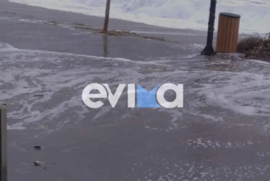 Μέχρι τις αυλές των σπιτιών και των καταστημάτων στα Νέα Στύρα έφτασαν τα νερά του Νότιου Ευβοϊκού κόλπου από τους ισχυρούς ανέμους εντάσεως 9 μποφόρ που πνέουν στην Εύβοια.