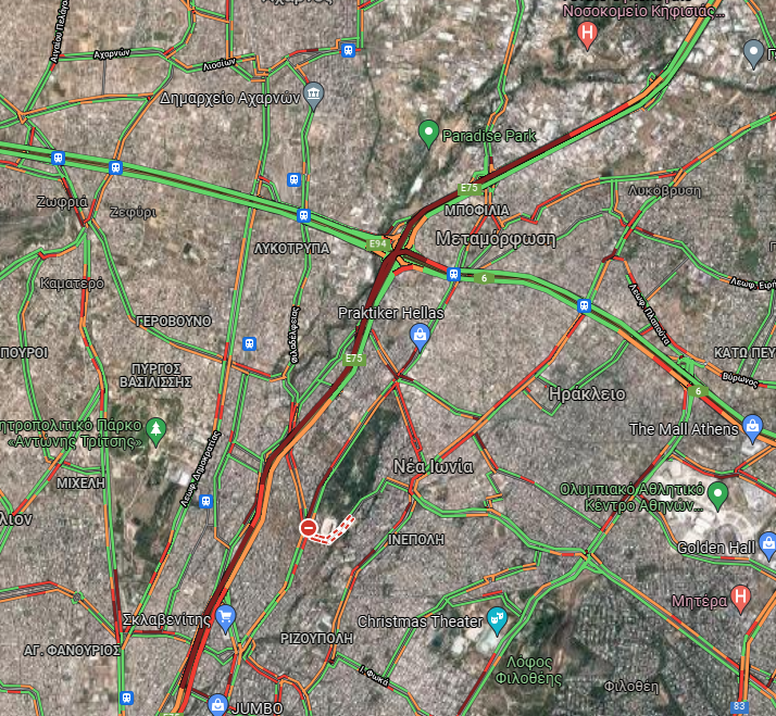 Όπως φαίνεται και στον χάρτη αυτή τη στιγμή η κίνηση στην κάθοδο του Κηφισού, δηλαδή στο ρεύμα προς Πειραιά, είναι μεγάλη μέχρι και το ύψος στα Άνω Πατήσια, με τα οχήματα να κινούνται σημειωτόν.