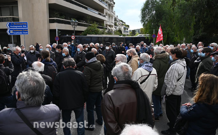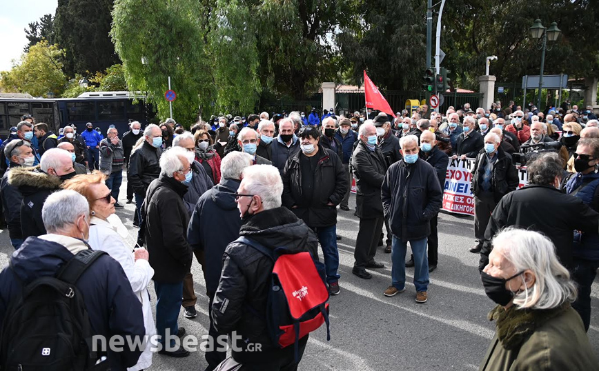 Οι συναξιούχοι συγκεντρώθηκαν αρχικά στην πλατεία Καλυθμώνος για να οδηγηθούν στη συνέχεια με πορεία στο Μέγαρο Μαξίμου. Όμως στο πλάι της Βουλής κλούβες δεν τους επέτρεψαν να συνεχίσουν τον δρόμο. Μετά από διαπραγμάτευση, τελικά οι κλούβες αποχώρησαν και οι διαδηλωτές έφτασαν στο Μαξίμου.