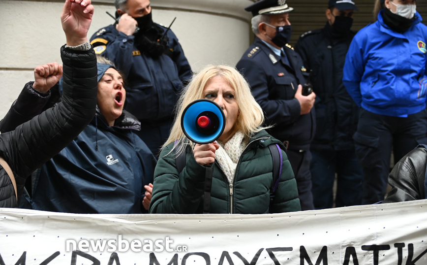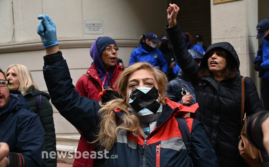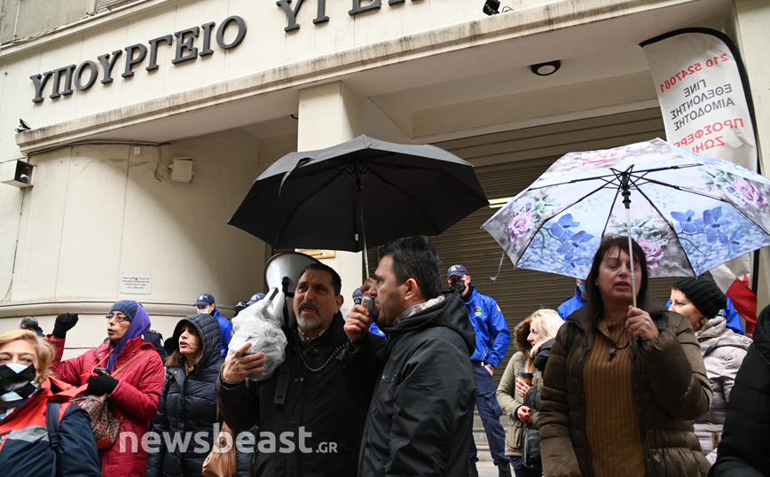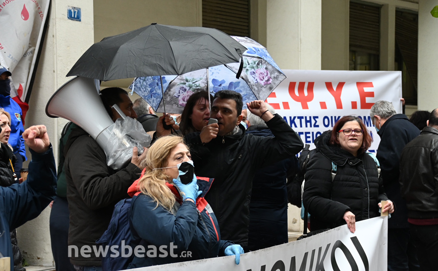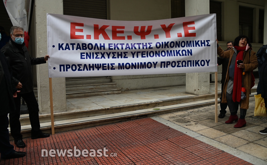 «Καταβολή έκτακτης οικονομικής ενίσχυσης υγειονομικών» και «προσλήψεις μόνιμου προσωπικού», ζητούν ακόμη οι συγκεντρωμένοι, σύμφωνα με ένα ακόμη πανό που κρατούν στα χέρια τους.