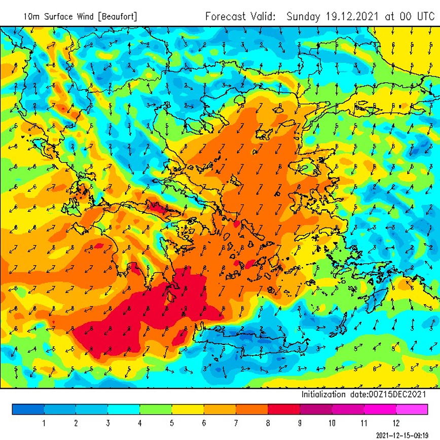 Στον Πέμπτο χάρτη μας αποτυπώνονται οι εντάσεις και διευθύνσεις των ανέμων όπου οι βοριάδες μέσα στο Αιγαίο θα φτάσουν ακόμη και τα 8 με 9 μποφόρ γεγονός που ίσως δημιουργήσει προβλήματα στις θαλάσσιες συγκοινωνίες.