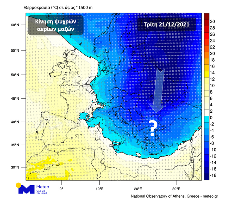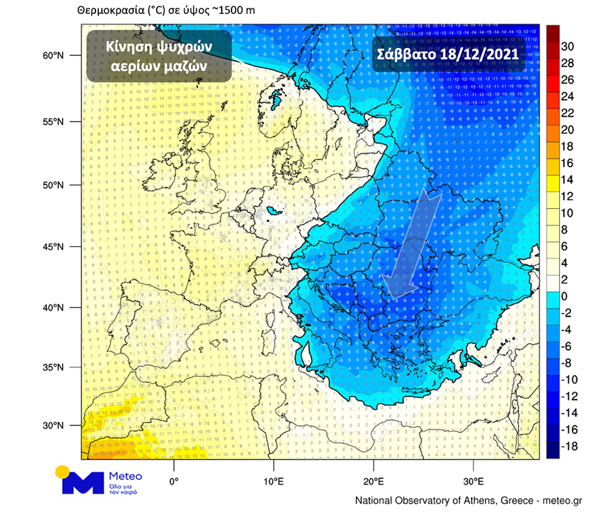 «Μετά από έναν θερμό σχετικά Νοέμβριο και πρώτο μισό του Δεκεμβρίου, η θερμοκρασία στη χώρα μας έχει ήδη υποχωρήσει σε επίπεδα ελαφρώς κάτω από τα κανονικά για την εποχή. Το Σάββατο 18 Δεκεμβρίου 2021 αναμένουμε περαιτέρω πτώση του υδραργύρου σε όλη την Ελλάδα λόγω της εισβολής ψυχρών αερίων μαζών πολικής προέλευσης από τη Βόρεια Ευρώπη. Η πτώση της θερμοκρασίας προβλέπεται να συνοδεύεται από χιονοπτώσεις σε χαμηλά υψόμετρα, ακόμη και στα πεδινά της βόρειας και κεντρικής χώρας, όμως λεπτομέρειες για το ποιες περιοχές θα επηρεαστούν σημαντικά θα δοθούν από την υπηρεσία METEO του Εθνικού Αστεροσκοπείου Αθηνών την Παρασκευή 17/12 αξιολογώντας τα νεότερα προγνωστικά στοιχεία.
