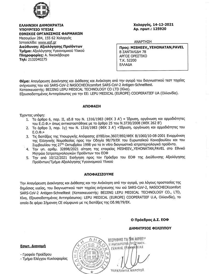 Την απαγόρευση διακίνησης και διάθεσης καθώς και ανάκλησης από την αγορά, για λόγους προστασίας της δημόσιας υγείας, του διαγνωστικού τεστ ταχείας ανίχνευσης του ιού SARS-CoV-2 NASOCHECKcomfort SARS-CoV-2 Antigen-Schnelltest, αποφάσισε ο ΕΟΦ.