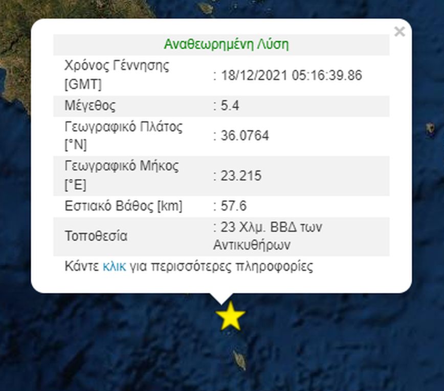 Σύμφωνα με το Γεωδυναμικό Ινστιτούτο Αθηνών, το επίκεντρο του σεισμού εντοπίζεται 23 χιλιόμετρα βορειοδυτικά των Αντικυθήρων και είχε εστιακό βάθος 57,6 χλμ.