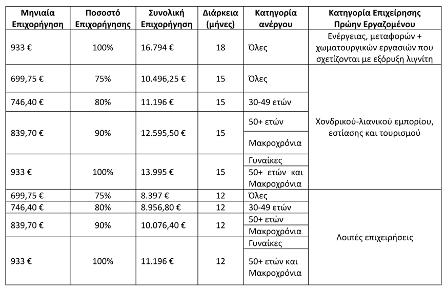 Η διάρκεια του προγράμματος είναι 12-18 μήνες, το ποσοστό επιχορήγησης μισθού και εισφορών κυμαίνεται μεταξύ 75-100%, ενώ το ποσό επιχορήγησης κυμαίνεται μεταξύ 700-933 ευρώ μηνιαία και 8.397- 16.794 ευρώ συνολικά, ανάλογα με την κατηγορία του ανέργου και του κλάδου της επιχείρησης που εργαζόταν. Στην επιχορήγηση του μισθολογικού και μη μισθολογικού κόστους συμπεριλαμβάνονται δώρα εορτών και επίδομα αδείας.
