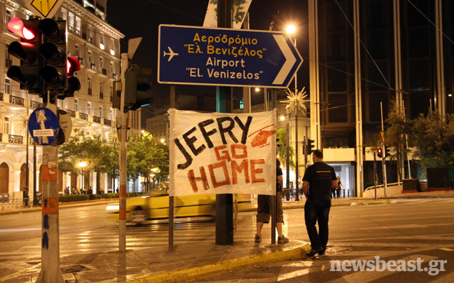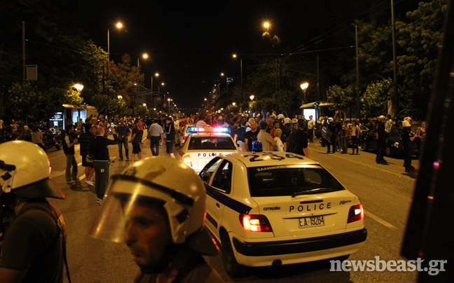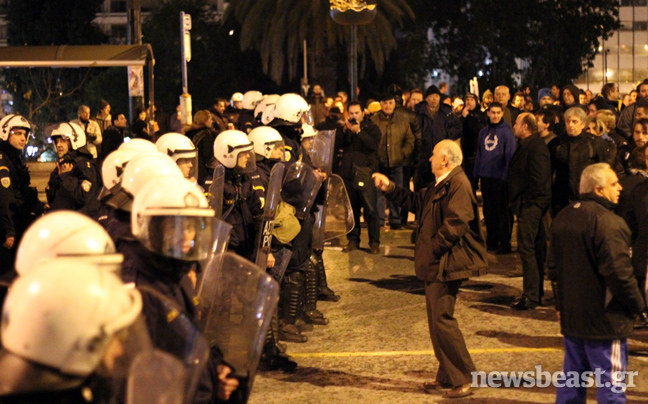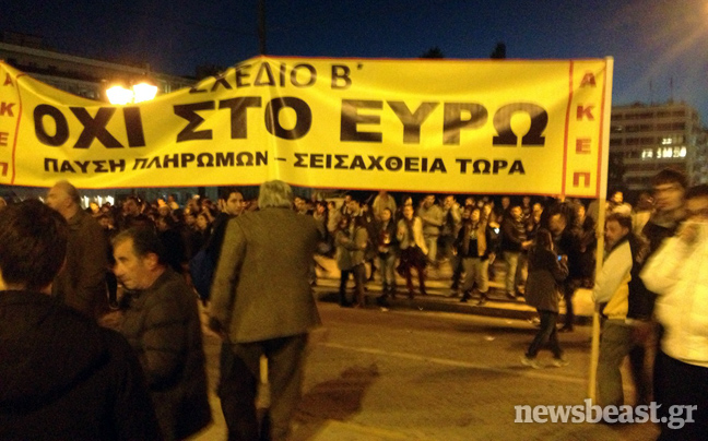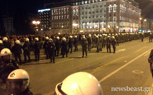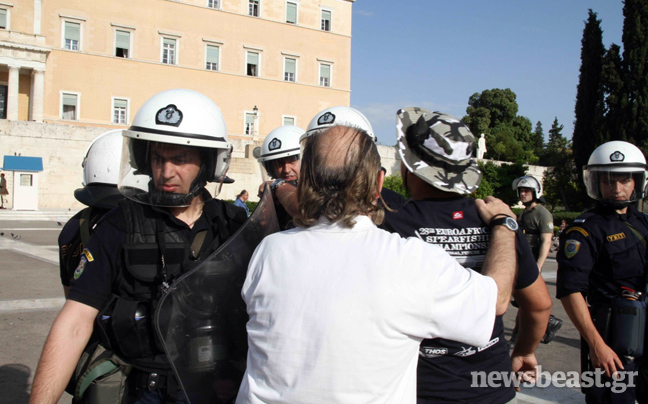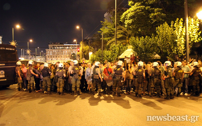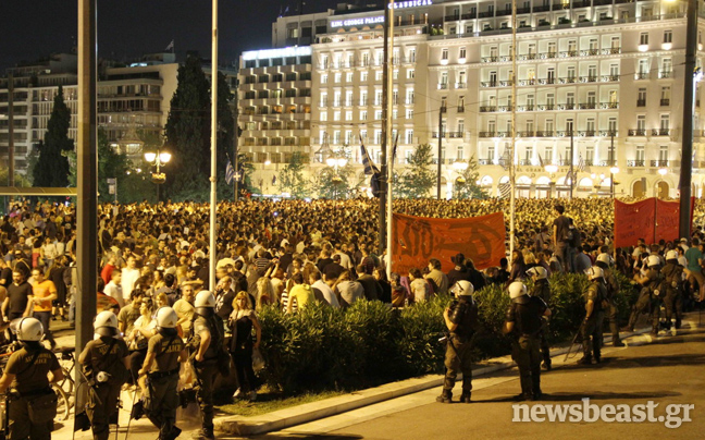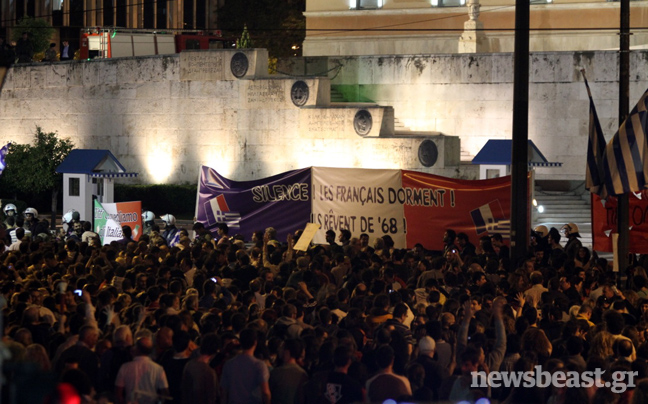 Συνθήματα όπως «Ελλάς Ελλάς» επικρατούσαν στον χώρο μπροστά από τη Βουλή, όπου ήταν κυρίαρχη η εικόνα των ελληνικών σημαιών. Στην κάτω πλατεία με τις σκηνές, εντόπιζε κανείς κατά κύριο λόγο ανθρώπους από τον ΣΥΡΙΖΑ, την ΑΝΤΑΡΣΥΑ, αναρχικούς της Αντιεξουσιαστικής Κίνησης (Α/Κ) και άλλες ομάδες, φοιτητές, συνδικαλιστές…