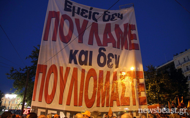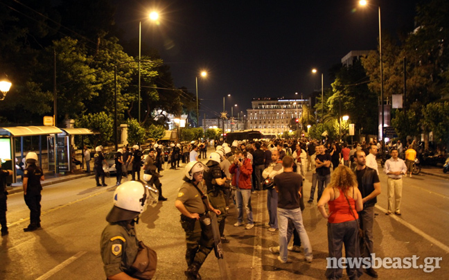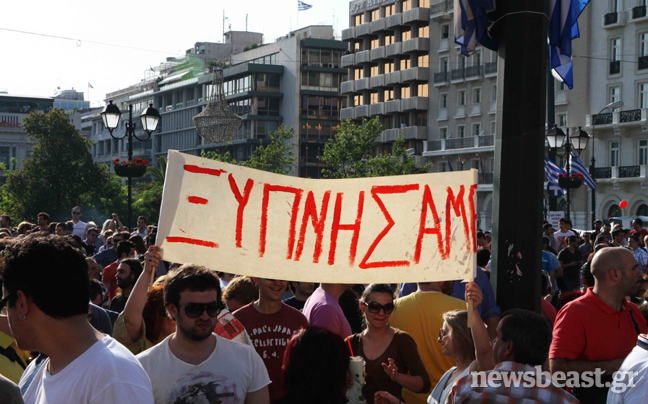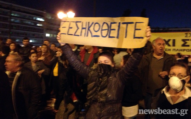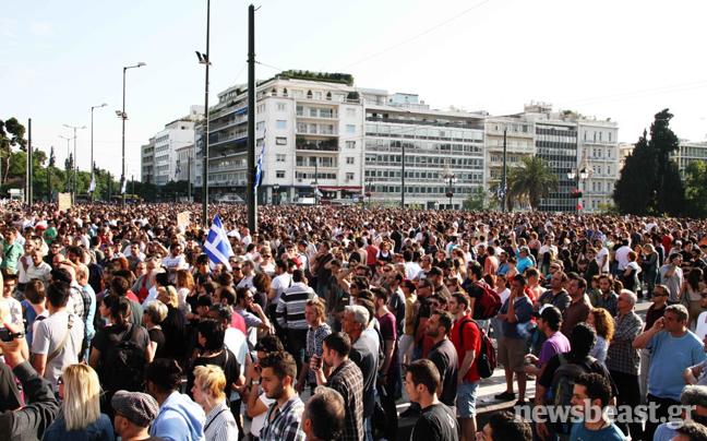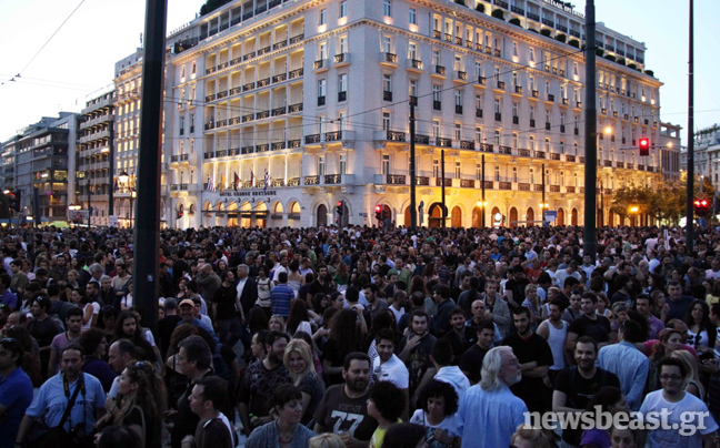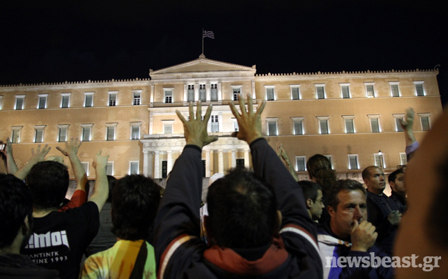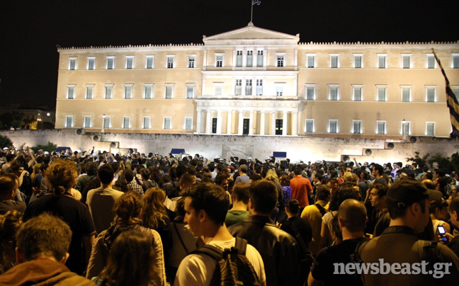 Δεν άργησε η αντίδραση εκ μέρους των Ελλήνων, οι οποίοι απηύθυναν κάλεσμα αγανάκτησης μέσω facebook αλά… ισπανικά, το οποίο ξεπέρασε τα δεκάδες χιλιάδες shares σε σύντομο χρονικό διάστημα. Με σημαίες και πλακάτ στα χέρια, χτυπώντας κατσαρολικά και φυσώντας σφυρίχτρες, δεκάδες χιλιάδες άνθρωποι έδωσαν το παρών έξω από το Κοινοβούλιο. «Ξυπνήσαμε» ανέγραφαν ορισμένα από τα πανό.