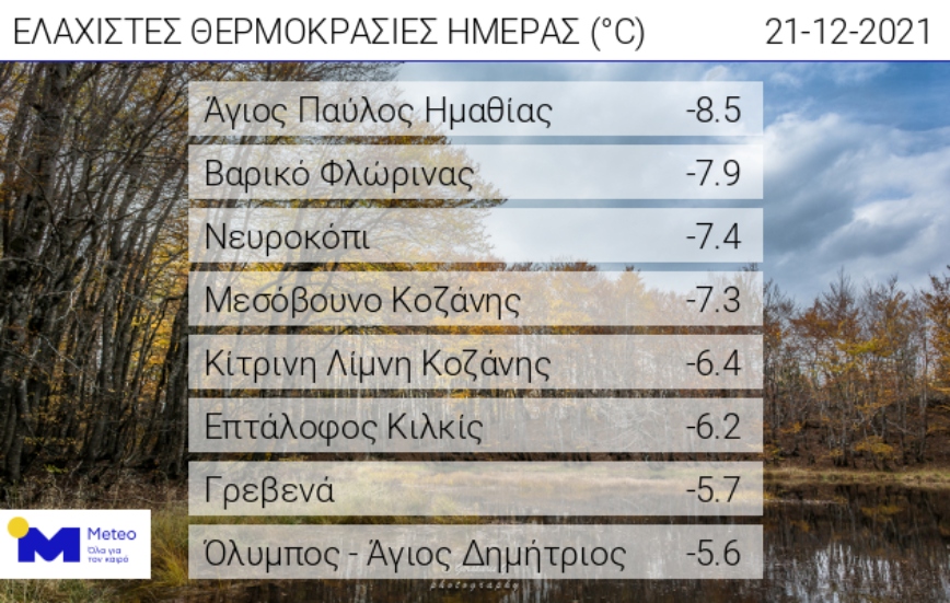 Δριμύ ψύχος επικρατεί στα ορεινά της χώρας το πρωί της Τρίτης (21/12), με την ελάχιστη θερμοκρασία να καταγράφεται Άγιο Παύλο Ημαθίας όπου το θερμόμετρο έδειξε -8,5 βαθμούς Κελσίου.