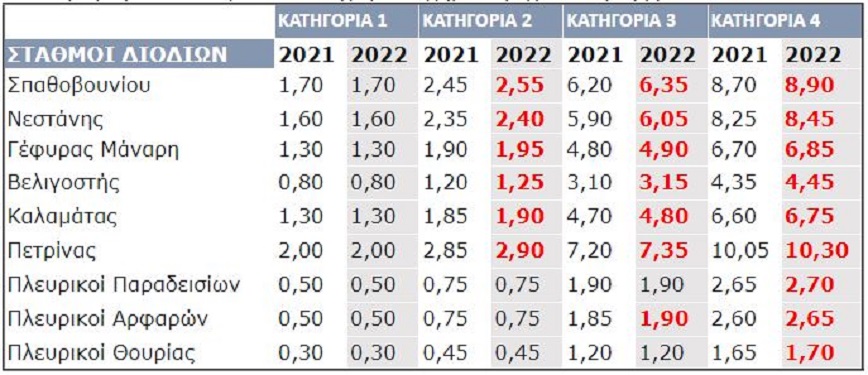 Οι νέες τιμές ανά σταθμό και κατηγορία οχήματος έχουν ως εξής: