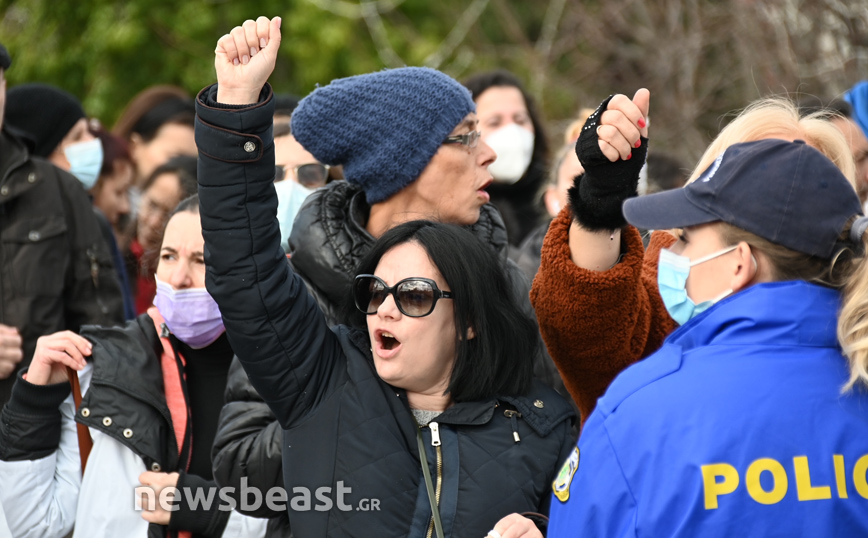 Κρατώντας πανό, πλακάτ και φωνάζοντας συνθήματα όπως «όχι στην υποχρεωτικότητα του εμβολιασμού και τον εξαναγκασμό» οι υγειονομικοί ζητούν να επιστρέψουν στη δουλειά τους όσοι αρνούνται να κάνουν το εμβόλιο κατά του κορονοϊού.