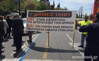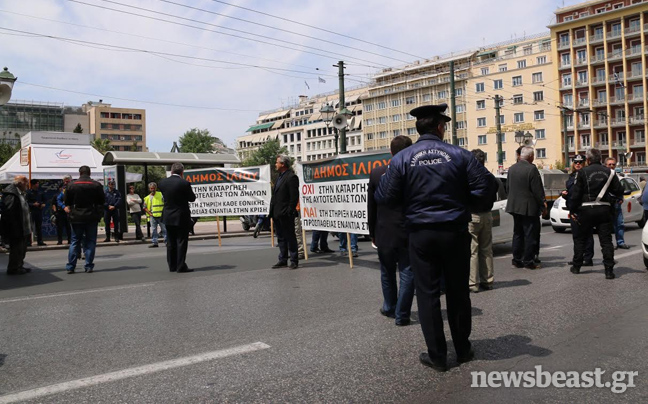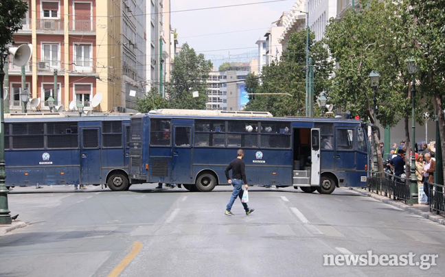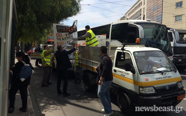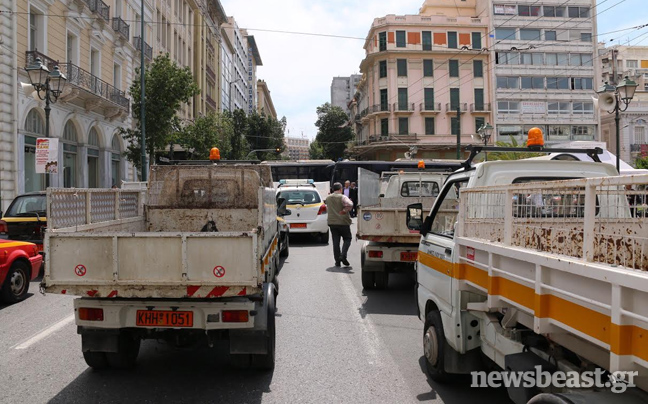 Κλούβες των ΜΑΤ έκλεισαν τον δρόμο σε πομπή οχημάτων των δήμων στην οδό Σταδίου στο ύψος της Κλαυθμώνος, ενώ βρισκόταν σε εξέλιξη η διαμαρτυρία εργαζομένων στους ΟΤΑ για την Πράξη Νομοθετικού Περιεχομένου της κυβέρνησης για τα ταμειακά διαθέσιμα.