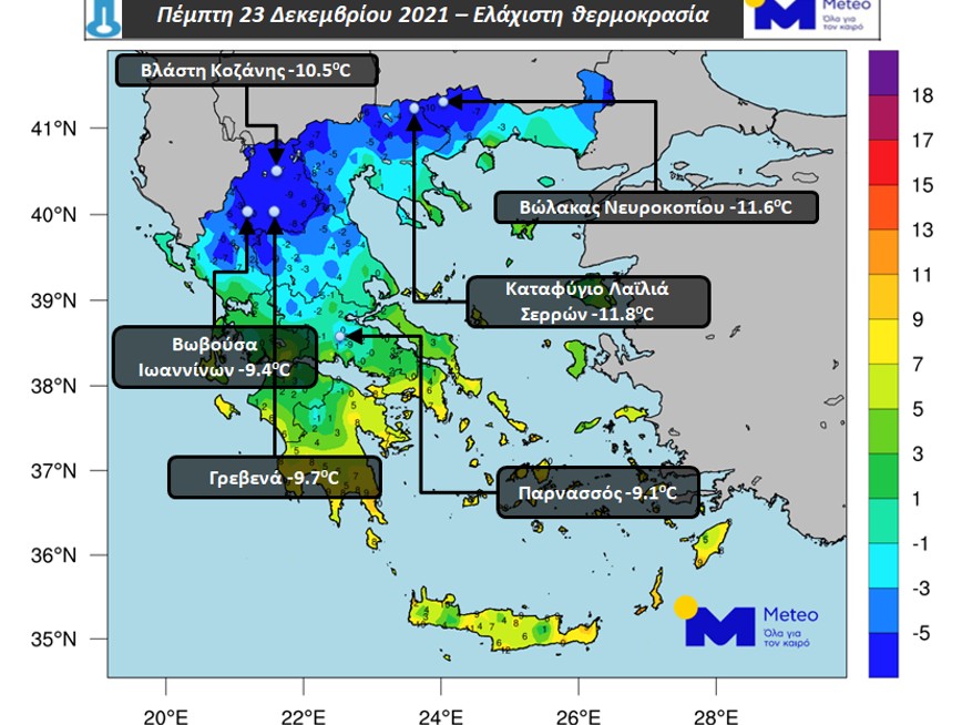 Σύμφωνα με τις καταγραφές για τον καιρό του δικτύου των σταθμών του Εθνικού Αστεροσκοπείου Αθηνών/meteo.gr, η χαμηλότερη θερμοκρασία καταγράφηκε στο ορεινό καταφύγιο Λαϊλιά Σερρών (-11,8 βαθμοί Κελσίου), ενώ πολύ χαμηλές θερμοκρασίες καταγράφηκαν επίσης στο Βώλακα Νευροκοπίου (-11,6), στη Βλάστη Κοζάνης (-10,5), στα Γρεβενά (-9,7), στη Βωβούσα Ιωαννίνων (-9,4), και στο Χ/Κ Παρνασού Κελάρια (-9,1).
