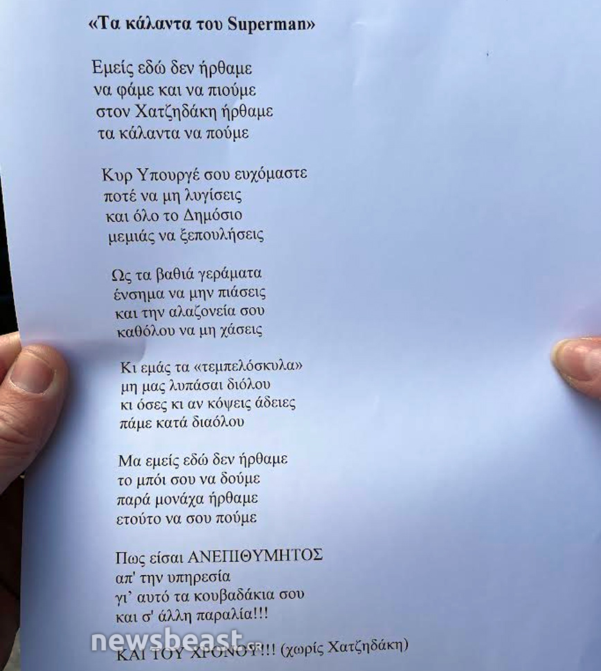 «Ως τα βαθιά γεράματα ένσημα να μην πιάσεις και την αλαζονεία σου καθόλου να μην χάσεις. Κι εμάς τα ”τεμπελόσκυλα” μη μας λυπάσαι διόλου κι όσες κι αν κόψεις άδειες πάμε κατά διαόλου» ανέφεραν οι εργαζόμενοι.