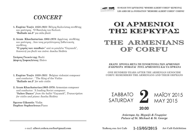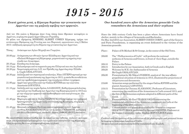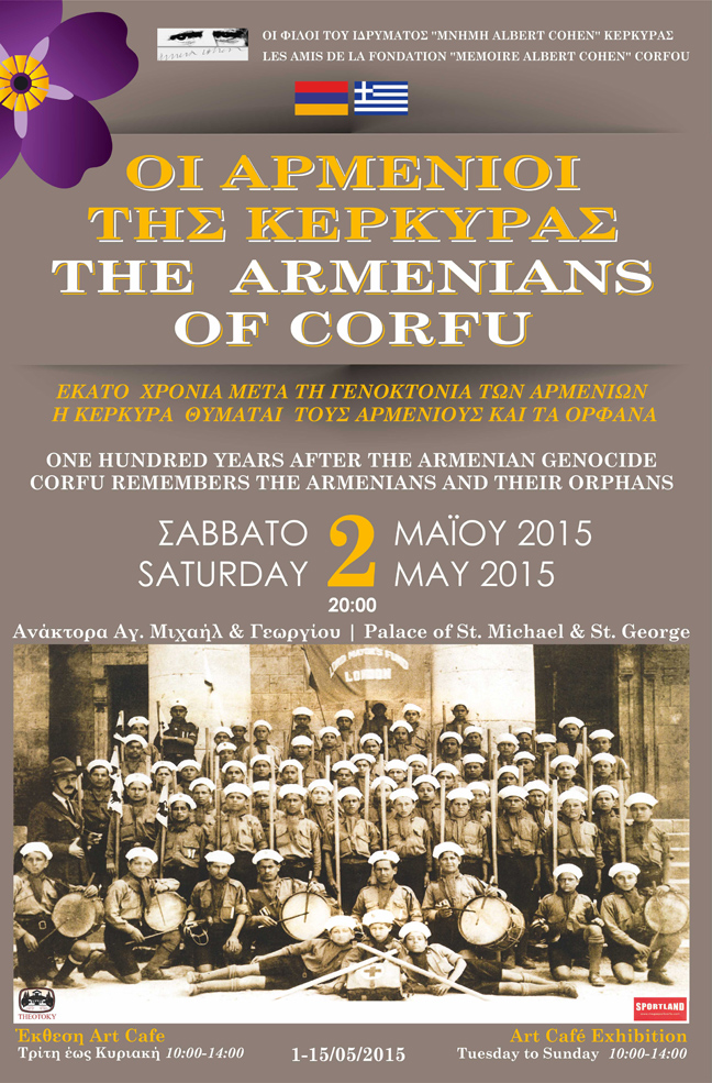Εκδήλωση μνήμης για τη συμπλήρωση 100 χρόνων από τη γενοκτονία των Αρμενίων και τη μαζική άφιξη των ορφανών στην Κέρκυρα, διοργανώνουν οι φίλοι του ιδρύματος «Μνήμη Albert Cohen», Κέρκυρας.