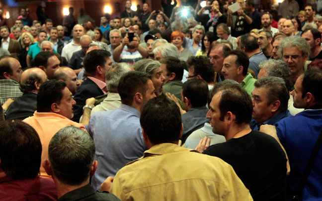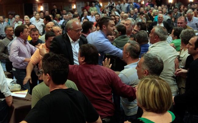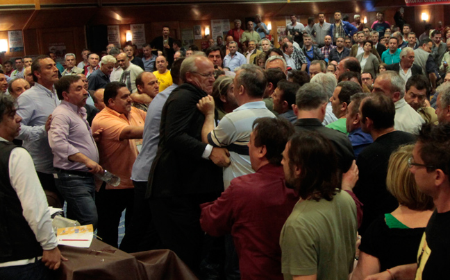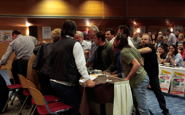 Ο επικεφαλής της ΑΣΚ-ΟΤΑ, Βασίλης Γκιτάκος κατηγορεί τον νυν πρόεδρο, Θέμη Μπαλασόπουλο ότι του επιτέθηκε με ένα ποτήρι.