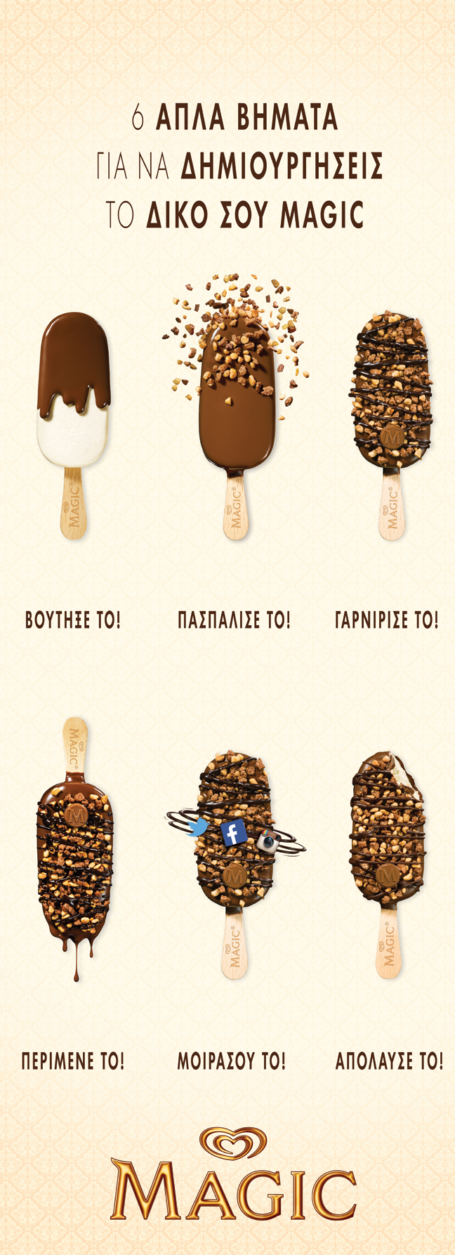 Το φετινό Magic Pleasure Store θα «μαγέψει» ακόμα περισσότερο τους pleasureseekers! Εκτός από τα all time classic αγαπημένα toppings, όπως καραμελωμένο αμύγδαλο, μπισκότο, καρύδα, αλατισμένο φιστίκι ή τριμμένο χώνακι με κομματάκια σοκολάτας , έρχονται νέα, ανατρεπτικά toppings που σας δίνουν τη δυνατότατα για άπειρους συνδυασμούς με την βελούδινη σοκολάτα Magic, ενώ εγγυώνται ένα απίθανο αποτέλεσμα!