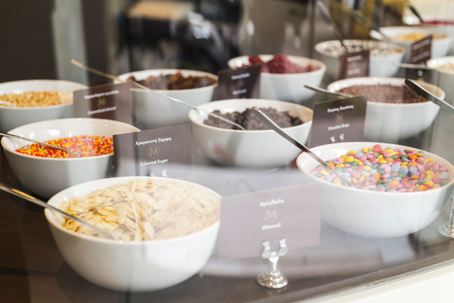 Αρχικά επιλέγετε έως 3 toppings με τα οποία θα γαρνίρετε το παγωτό σας. Σας περιμένει μια μεγάλη ποικιλία από διαφορετικές γαρνιτούρες. Διαλέξτε ανάμεσα στα κλασσικά, στα ιδιαίτερα και στα πιο ανατρεπτικά.