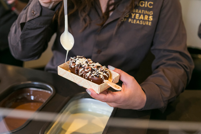 Τέλος διαλέγετε τη Magic σοκολατένια επικάλυψη. Επιλέγετε σε ποιο από τα 3 είδη σοκολάτας Magic (κλασσική, λευκή ή μαύρη) προτιμάτε να βυθιστεί μέσα το παγωτό σας και ο Pleasure Maker θα δημιουργήσει μπροστά σας το δικό σας μοναδικό παγωτό ξυλάκι Magic.