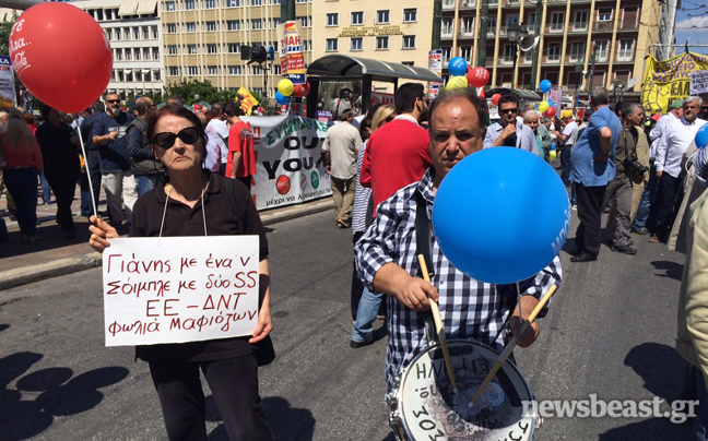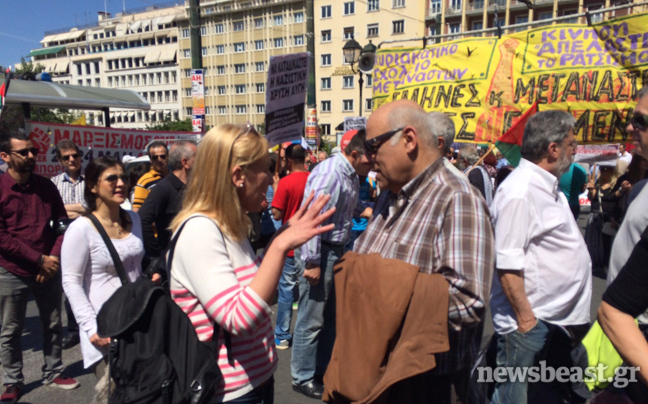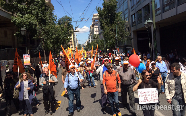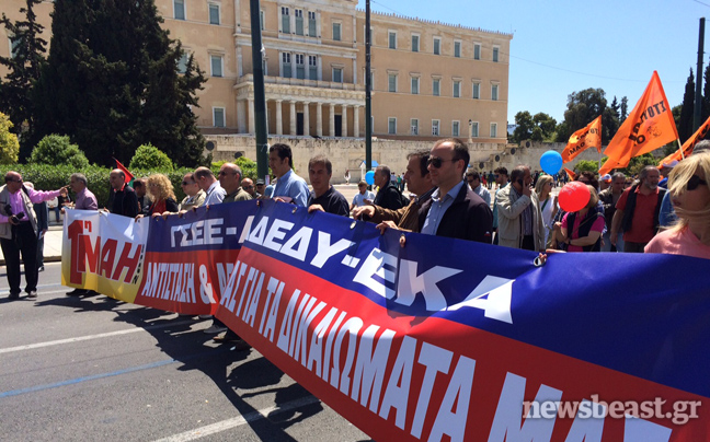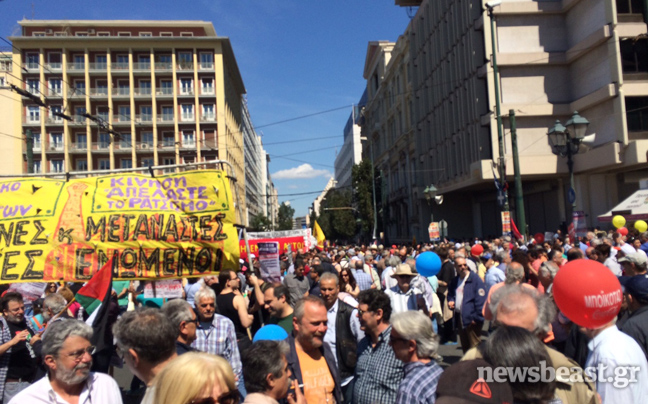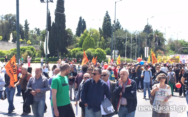Πορεία στην πλατεία Συντάγματος, όπου πριν από λίγο ολοκληρώθηκε η συγκέντρωση του ΠΑΜΕ, ξεκίνησαν εκατοντάδες διαδηλωτές που συμμετέχουν στο συλλαλητήριο της ΓΣΕΕ-ΑΔΕΔΥ για την Εργατική Πρωτομαγιά.