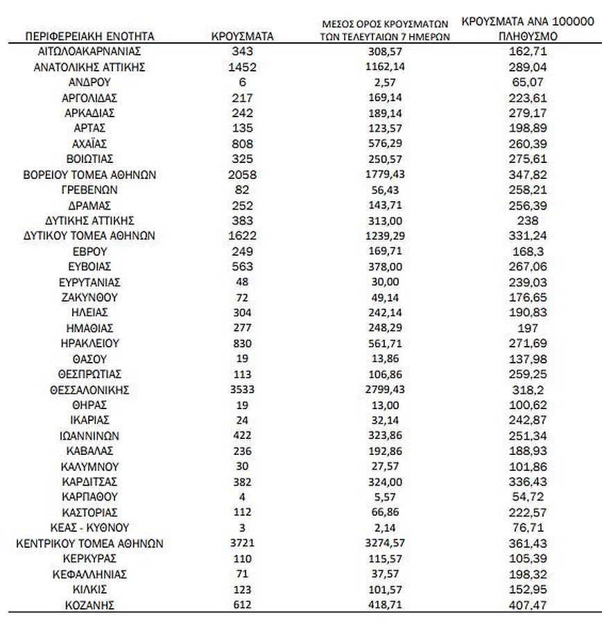 Αναλυτικότερα τα κρούσματα στις περιφερειακές ενότητες που ανήκουν στην Αττική: