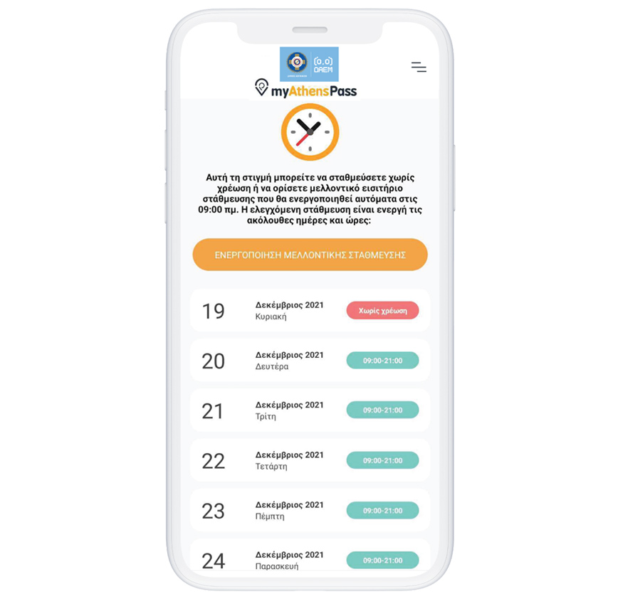 Τη δυνατότητα σε κάθε οδηγό που παρκάρει στην Αθήνα να προγραμματίζει, μέσω της εφαρμογής «myAthensPass», την έναρξη της στάθμευσής του, ακόμη και εκτός ωραρίου λειτουργίας της ελεγχόμενης στάθμευσης, προκειμένου να ενεργοποιείται αυτόματα κατά την έναρξή της (στις 9 π.μ.), δίνει από σήμερα, Δευτέρα (3/1) ο Δήμος Αθηναίων. Πρόκειται για σημαντική ψηφιακή αναβάθμιση, που εξασφαλίζει τη νομιμότητα της στάθμευσης στο κέντρο και τις γειτονιές της Αθήνας, και επομένως την αποφυγή επιβολής προστίμου από τη Δημοτική Αστυνομία.