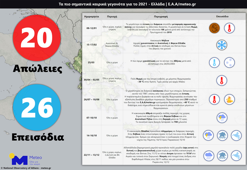 Το 2021 χαρακτηρίστηκε από 26 ακραία καιρικά φαινόμενα στην Ελλάδα και ορισμένα από αυτά προκάλεσαν καταστροφές και τον θάνατο συνολικά 20 ανθρώπων, σύμφωνα με το meteo του Εθνικού Αστεροσκοπείου Αθηνών.