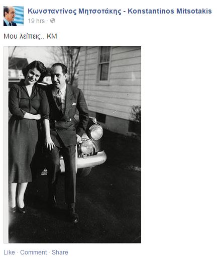 «Μου λείπεις…ΚΜ» έγραψε σε ανάρτησή του στο Facebook ο Κωνσταντίνος Μητσοτάκης, ανεβάζοντας μάλιστα μια παλιά φωτογραφία του με τη Μαρίκα.