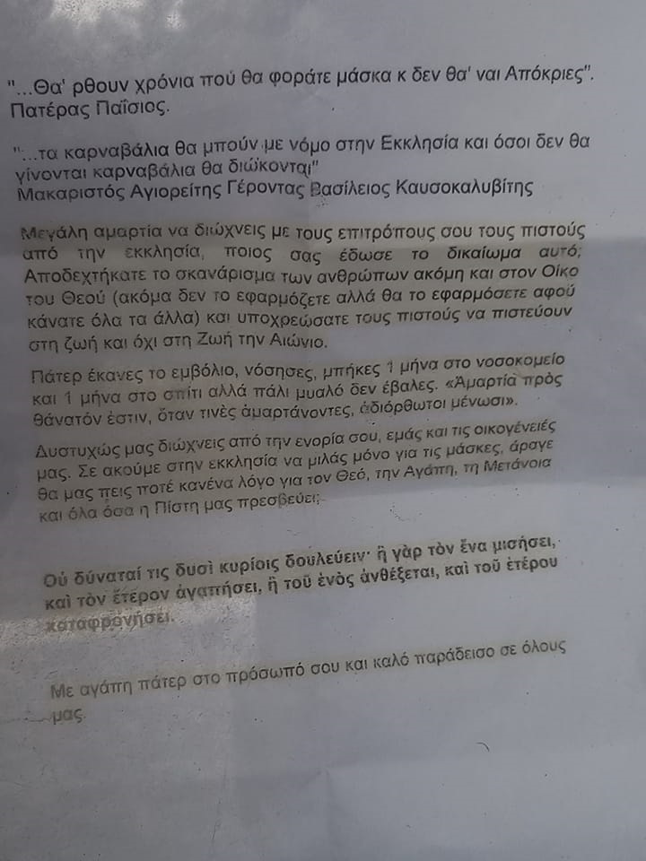 Η απάντηση των αρνητών ήρθε με το παρακάτω φέιγ βολάν που ανάμεσα στα άλλα γράφουν: «Πάτερ έκανες το εμβόλιο, νόσησες, μπήκες ένα μήνα στο νοσοκομείο, ένα μήνα στο σπίτι, αλλά μυαλό δεν έβαλες.»