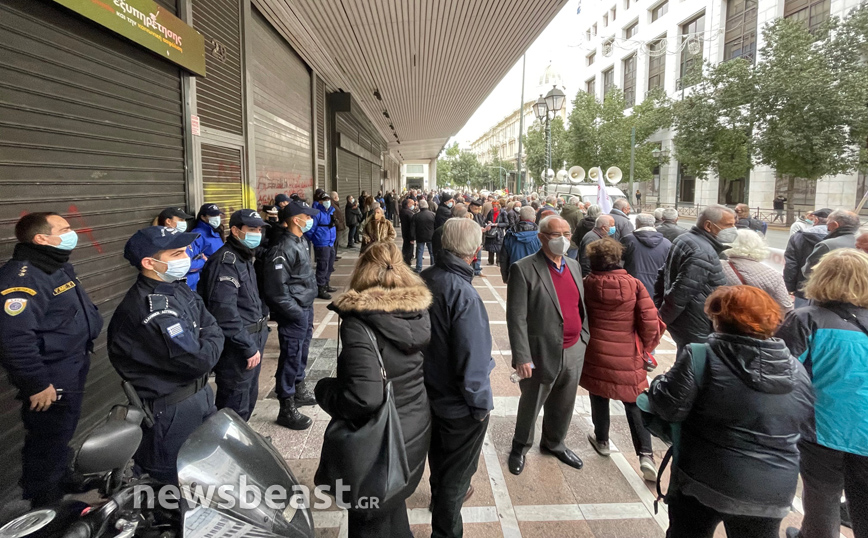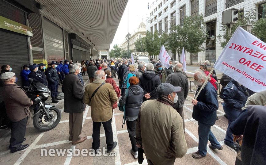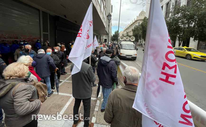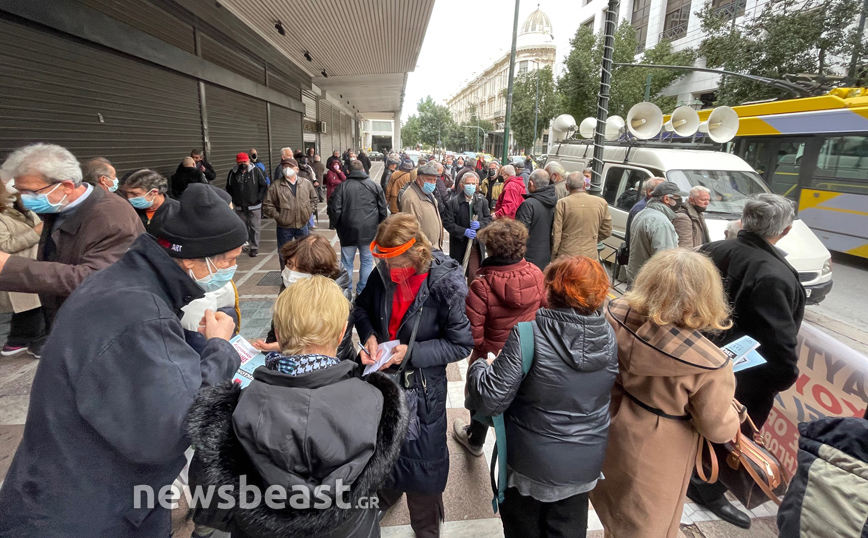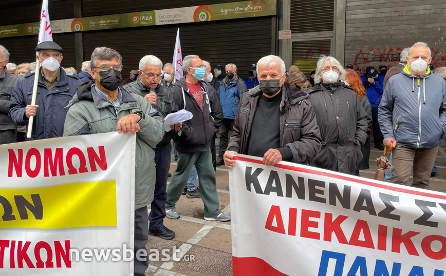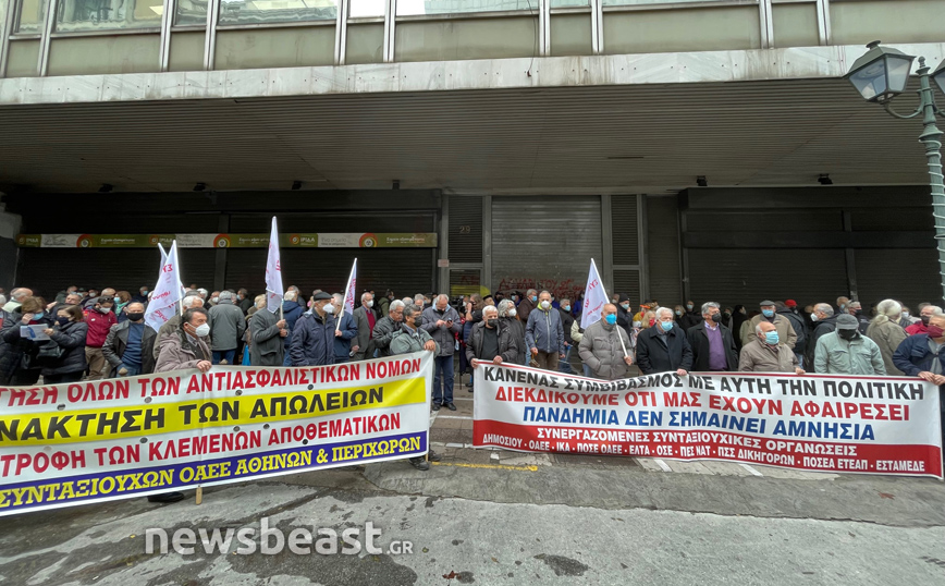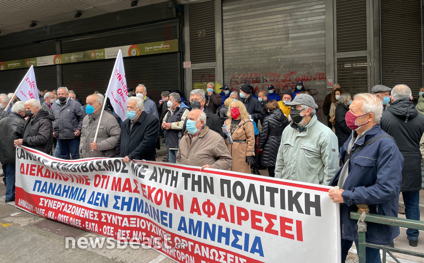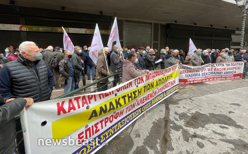 «Κανένας συμβιβασμός με αυτή την πολιτική. Διεκδικούμε ό,τι μας έχουν αφαιρέσει. Πανδημία δεν σημαίνει αμνησία» αναγράφεται σε ένα πανό που κρατούν συνταξιούχοι έξω από το υπουργείο Εργασίας σήμερα.
