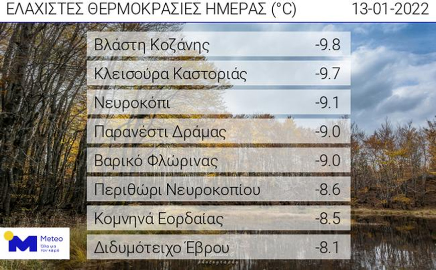 Οι χαμηλότερες ελάχιστες θερμοκρασίες καταγράφηκαν σε Βλάστη Κοζάνης (-9,8), Κλεισούρα Κοζάνης (-9,7), Νευροκόπι (-9,1), Παρανέστι Δράμας (-9,0) και Βαρικό Φλώρινας (-9,0).