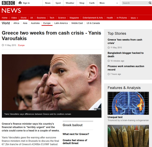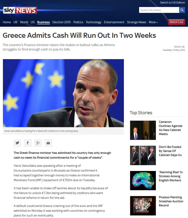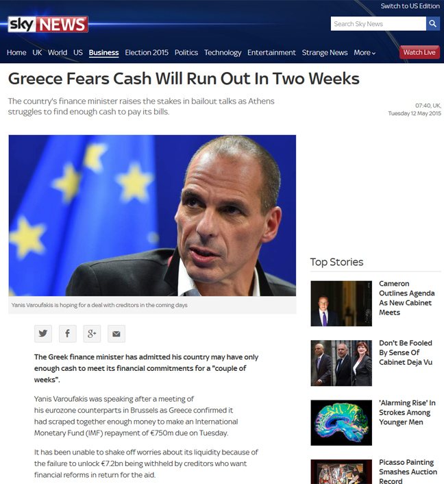 Το δημοσίευμα αναφέρει τις δηλώσει του υπουργού Οικονομικών Γιάννη Βαρουφάκη πως η ρευστότητα είναι φλέγον θέμα που πιέζει για επίτευξη συμφωνίας τις επόμενες δύο εβδομάδες. Το βρετανικό δίκτυο προσθέτει πως οι ανησυχίες παραμένουν λόγω της μη εκταμίευσης της δόσης των 7,2 δισεκατομμυρίων ευρώ από τους πιστωτές της Ελλάδας που ζητούν μεταρρυθμίσεις σε αντάλλαγμα για τη βοήθεια.