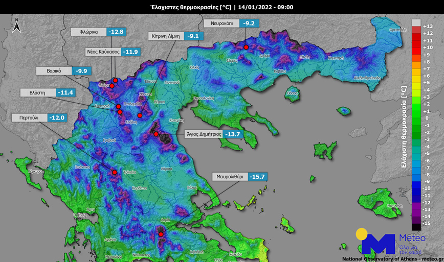 Οι ελάχιστες θερμοκρασίες έπεσαν κάτω και από τους -15 βαθμούς Κελσίου.