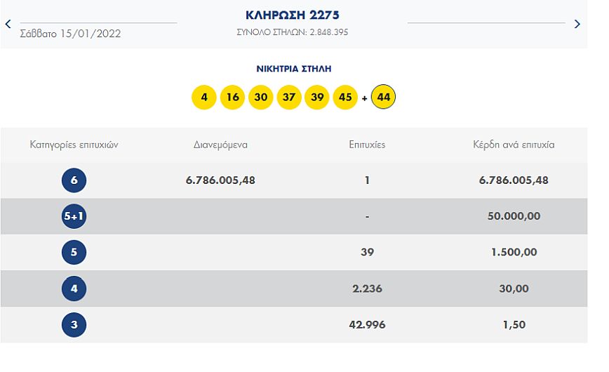 Οι έξι τυχεροί αριθμοί της κλήρωσης 2275 είναι: 4, 16, 30, 37, 39, 45 και έξτρα έβδομος αριθμός το 44.