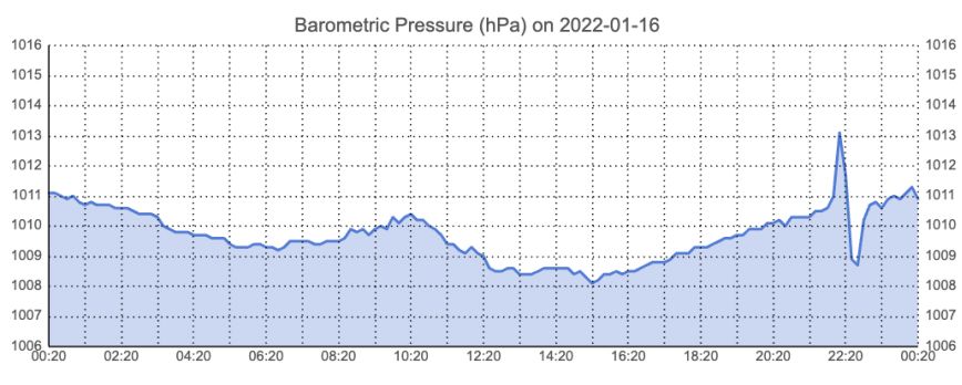 Πολλοί μετεωρολογικοί σταθμοί του δικτύου μας κατέγραψαν τη διακύμανση της ατμοσφαιρικής πίεσης που σχετίζεται με την έκρηξη του ηφαιστείου Hunga Tonga-Hunga Ha’apai στην Τόνγκα η οποία σημειώθηκε στις 07:10 το πρωί του Σαββάτου 15/01 ώρα Ελλάδας.