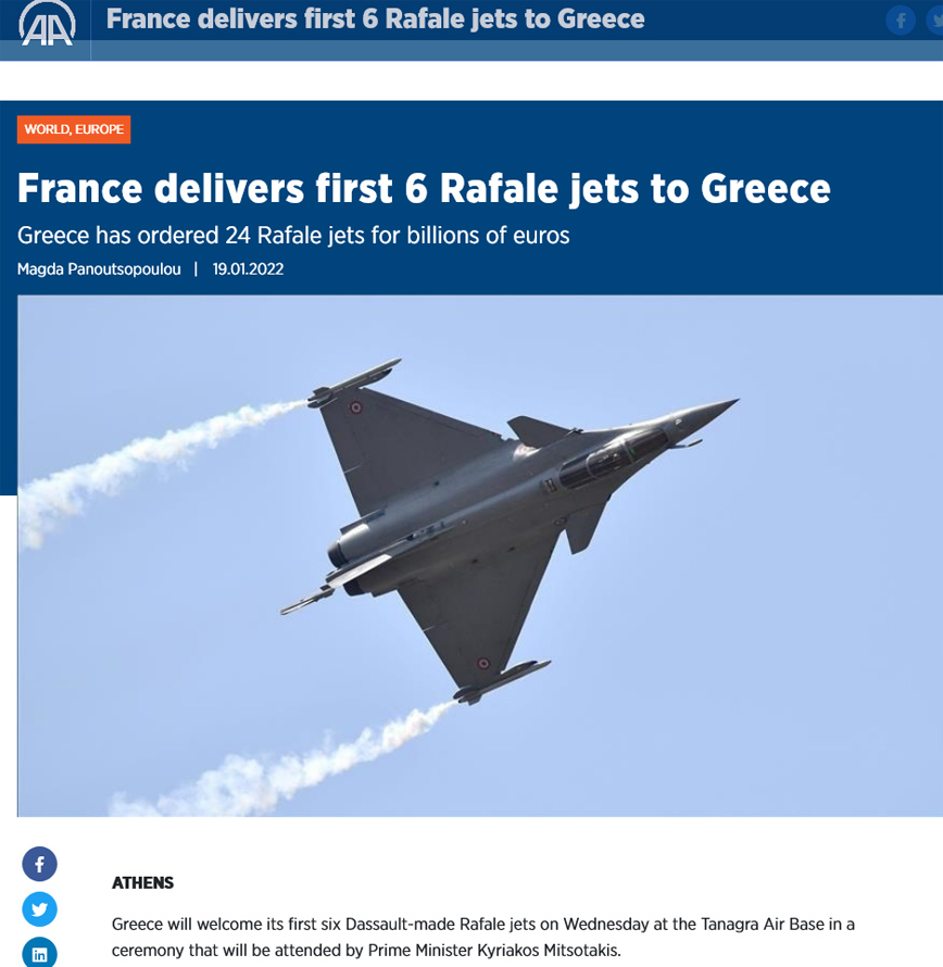 Σχετικό δημοσίευμα υπάρχει και στο τουρκικό πρακτορείο Anadolu, που γράφει πως «Η Γαλλία παραδίδει τα πρώτα έξι μαχητικά Rafale στην Ελλάδα».