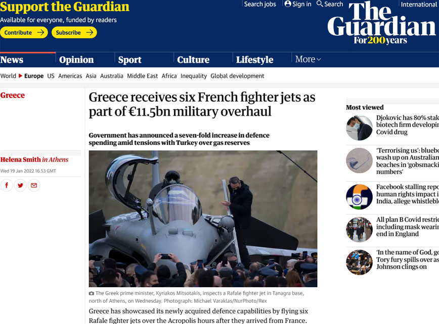 «Η Ελλάδα επέδειξε τις πρόσφατα αποκτηθείσες αμυντικές της ικανότητες πετώντας έξι μαχητικά αεροσκάφη Rafale πάνω από την Ακρόπολη λίγες ώρες μετά την άφιξή τους από τη Γαλλία», γράφει ο βρετανικός Guardian.