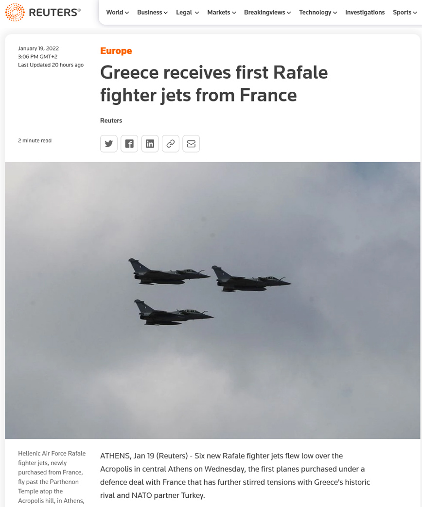 «Η Ελλάδα παραλαμβάνει τα πρώτα μαχητικά Rafale από τη Γαλλία» γράφει το πρακτορείο Reuters σε δημοσίευμά του για τα έξι νέα μαχητικά που πέταξαν πάνω από την Ακρόπολη. Το δημοσίευμα παρατηρεί πως οι σχετικές συμφωνίες «έχουν τροφοδοτήσει τη δυσπιστία της Τουρκίας», ενώ γίνεται αναφορά και στη δήλωση του πρωθυπουργού Κυριάκου Μητσοτάκη, σύμφωνα με την οποία «προφανώς δεν έχουμε ανάγκη την άδεια κανενός» για την απόκτηση των νέων Rafale.