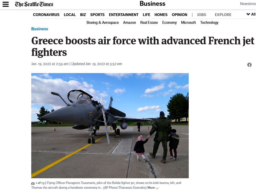Αλλά και οι Seattle Times αναφέρονται στην εξέλιξη, επικαλούμενοι δημοσίευμα του πρακτορείου Associated Press. «Η Ελλάδα ενισχύει την αεροπορία με προηγμένα γαλλικά μαχητικά», είναι ο τίτλος.