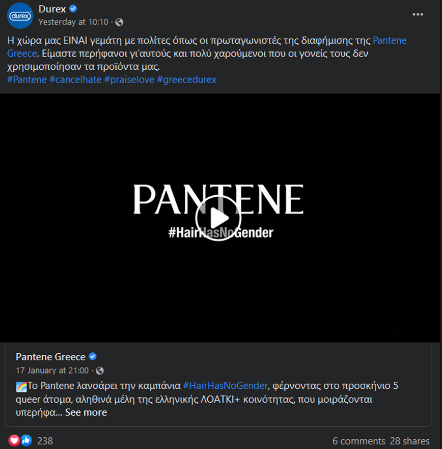 Η εταιρία προφυλακτικών Durex προχώρησε σε μια ανάρτηση στον επίσημο λογαριασμό της στο facebook και με ένα ευφάνταστο σχόλιο, δήλωσε την στήριξή της στην Pantene αλλά και στα μέλη της ΛΟΑΤΚΙ+ κοινότητας τονίζοντας πως είναι «πολύ χαρούμενοι που οι γονείς τους δεν χρησιμοποίησαν τα προϊόντα μας».