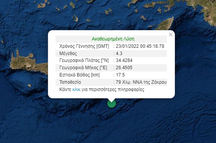 Η συγκεκριμένη δόνηση χαρακτηρίστηκε «ασθενής», με το επίκεντρό της να εντοπίζεται 79 χιλιόμετρα νότια-νοτιοανατολικά της Ζάκρου, στον νομό Λασιθίου.
