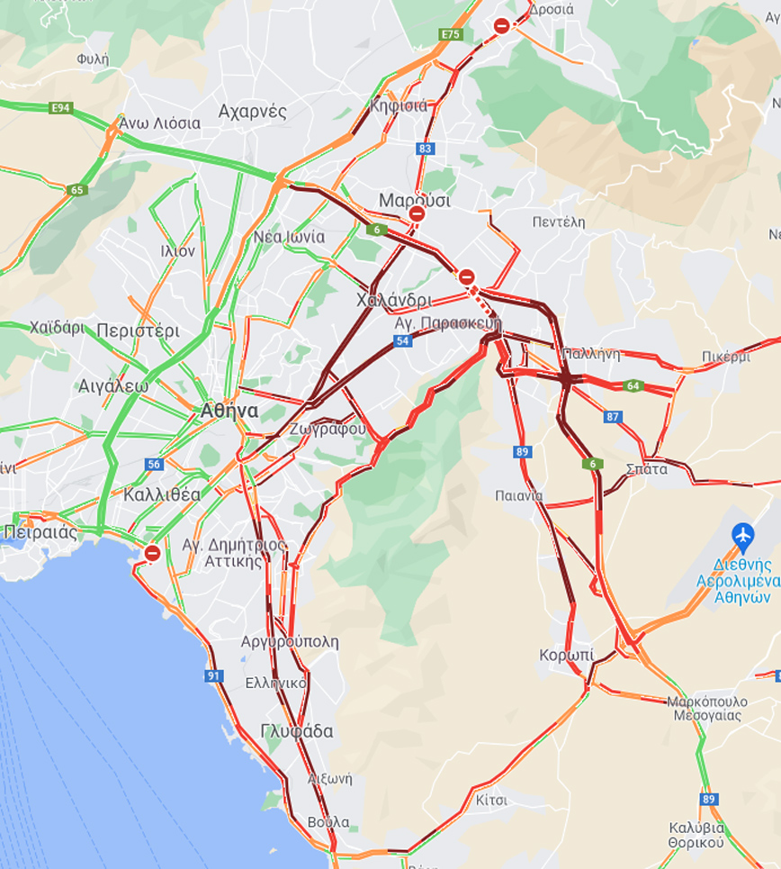 Ο χάρτης με την κίνηση τώρα στους δρόμους της Αττικής