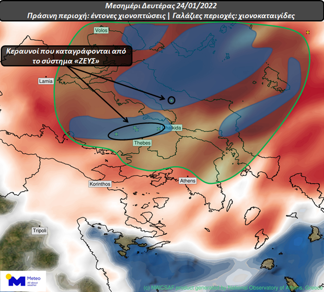 «Δορυφορικές εικόνες που λάβαμε και επεξεργαστήκαμε στο Εθνικό Αστεροσκοπείο Αθηνών / meteo.gr δείχνουν τις νεφώσεις κατακόρυφης ανάπτυξης που έχουν αναπτυχθεί σε περιοχές του Αιγαίου, της Εύβοιας και της Ανατολικής Στερεάς ήδη από τις πρωινές ώρες της Δευτέρας 24/01 και οι οποίες σε συνδυασμό με τις πολύ χαμηλές θερμοκρασίες έχουν ως αποτέλεσμα την εκδήλωση πυκνών χιονοπτώσεων και χιονοκαταιγίδων έως και σε παραθαλάσσια τμήματα.