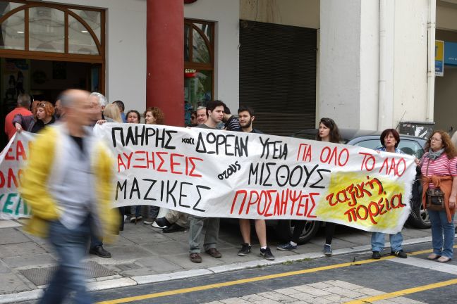 Στο πλαίσιο των απεργιακών κινητοποιήσεων ολιγομελής ομάδα εργαζομένων σε δημόσια νοσοκομεία πραγματοποίησε συγκέντρωση μπροστά στα γραφεία της 3ης και 4ης ΥΠΕ σε ένδειξη διαμαρτυρίας για την υποχρηματοδότηση και την υποστελέχωση των δημόσιων νοσηλευτικών ιδρυμάτων. Η μικρή συμμετοχή αποδόθηκε στο ότι οι περισσότεροι εργαζόμενοι επέλεξαν να συμμετάσχουν στην απεργιακή συγκέντρωση που πραγματοποιήθηκε στην Αθήνα.