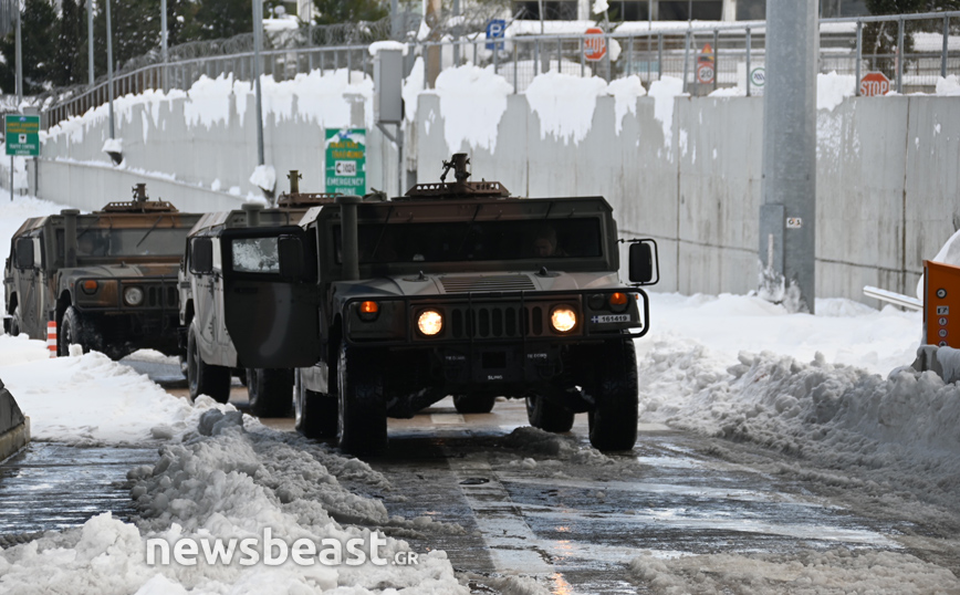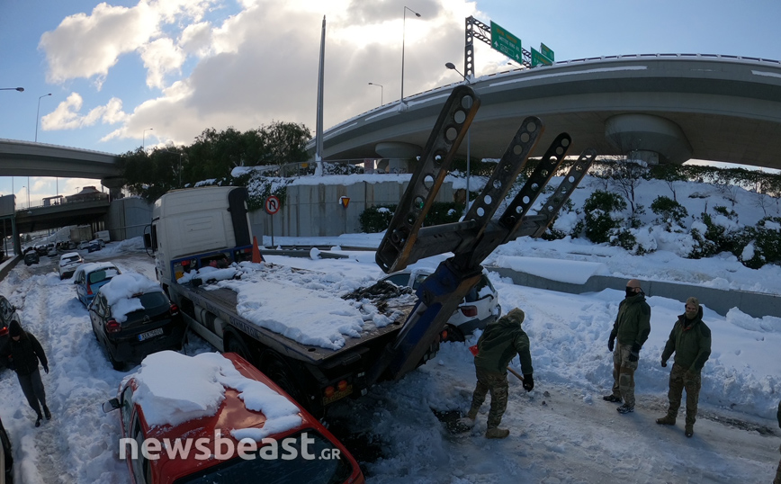 Μέσα στον αυτοκινητόδρομο διακρίνονται και αυτοκίνητα του στρατού, με τους άνδρες να επιχειρούν για τον απεγκλωβισμό και να συνδράμουν με τρόφιμα, νερό και κουβέρτες.